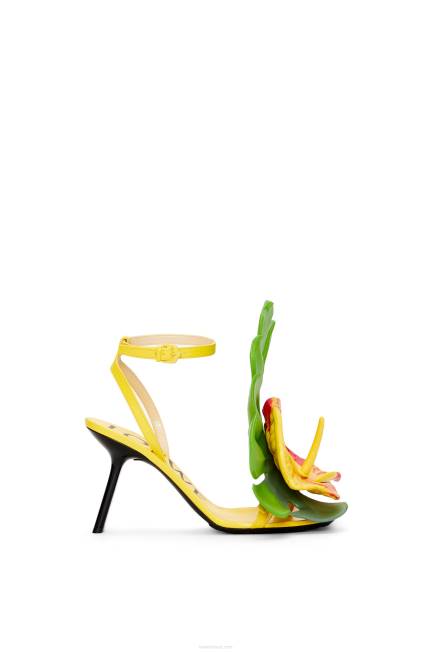 Sandália salto assimétrico em pele de cordeiro brilhante com folha de monstera e flor de antúrio confeccionada em espuma de borracha clara. Com salto laqueado, tira de tornozelo com fivela e tira de fivela única na ponta do pé. a coleção de sapatos ss23 joga com a tensão e o contraste: o artesanato se choca com uma atitude fetichista e os materiais naturais se chocam com o técnico. os principais detalhes incluem saltos divertidos, logotipos gráficos e dedos e tiras assimétricos