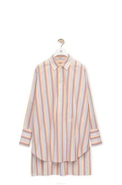 Vestido camiseiro com abotoamento na frente em algodão às riscas com gola e punhos destacáveis. bainha assimétrica e carcela abotoada.