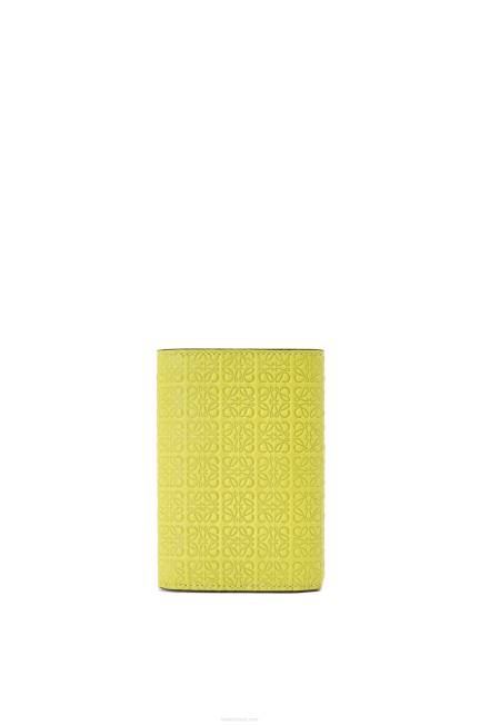 carteira pequena vertical em couro de bezerro de seda com padrão de anagramas em relevo.