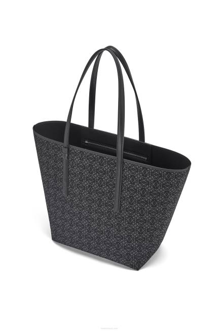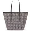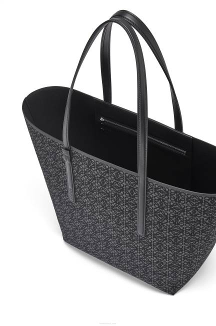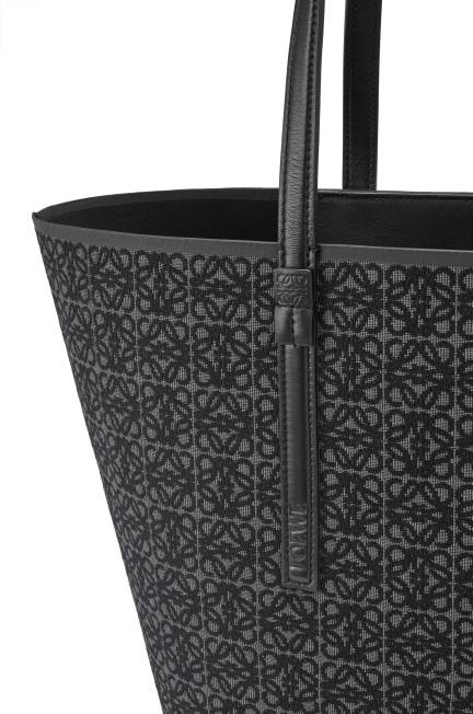 a t tote é uma bolsa leve e funcional com alças longas em couro de bezerro e uma silhueta simplificada com construção lateral invertida que dá nome à bolsa. esta versão é confeccionada em jacquard anagrama e couro de bezerro.