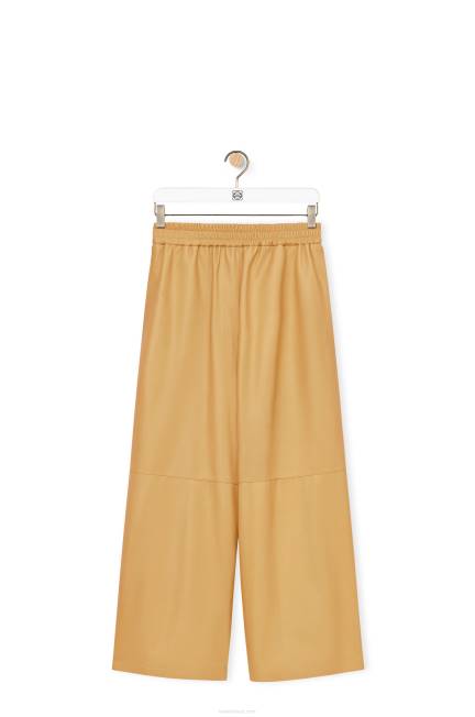 Calças largas cortadas em pele de cordeiro napa de cetim leve com cintura elástica, bolsos laterais e bolso traseiro de remendo com anagrama em relevo.