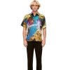 Camiseta de botão frontal em denim com uma impressão de colocação de céu mágico, bolso no peito e punhos abotoados. esta camisa faz parte da coleção cápsula do castelo em movimento da loewe x howl.
