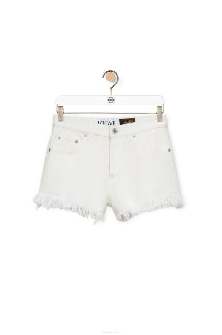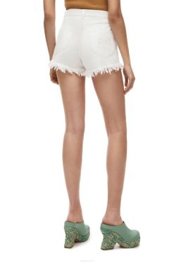 Calção de cinco bolsos em ganga com bainha crua e anagrama bordado texturizado.