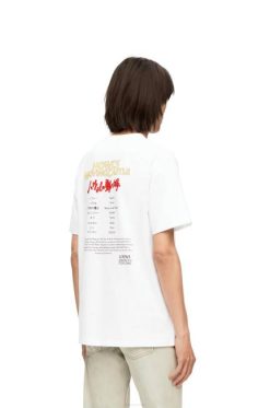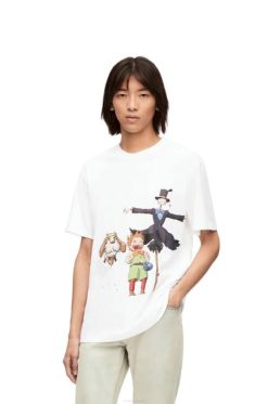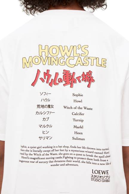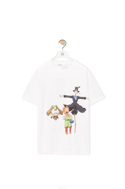 T-shirt de gola redonda em jersey leve de algodão com estampado de markl e cabeça de nabo e riscas bordadas na frente. com título do filme, lista de personagens e sinopse, bem como logotipo loewe studio ghibli impresso na parte de trás. esta camiseta faz parte da coleção castelo em movimento da loewe x howl.