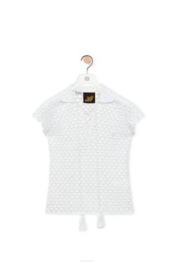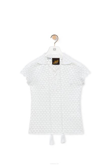 blusa polo de manga curta confeccionada artesanalmente em crochê com mangas bufantes e gola em renda com amarração em borlas.