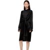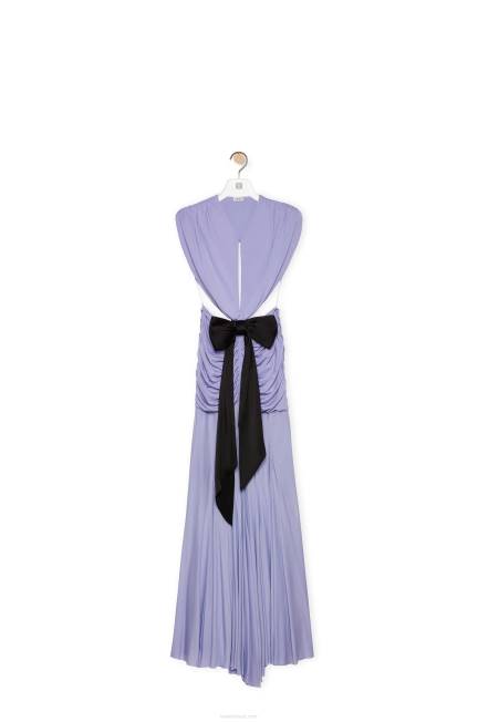 vestido drapeado em jersey crepe com decote nas costas, recorte no busto, laço de cetim na frente e saia godê semitransparente com detalhe franzido.