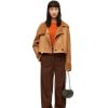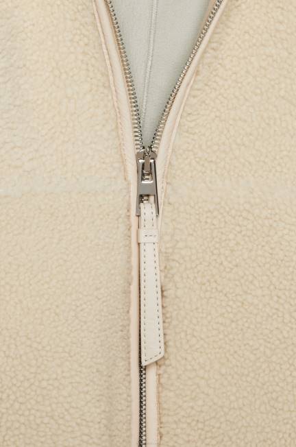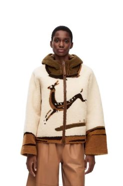 jaqueta com capuz confeccionada em lã merino leve e encaracolada.