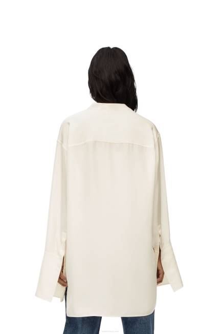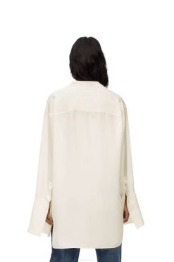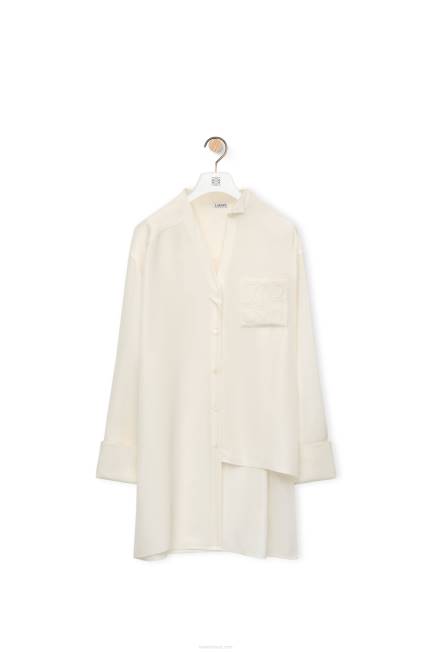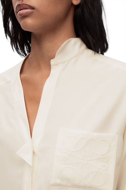 Blusa com abotoamento frontal em toile de seda lavada com gola asa desconstruída, bainha assimétrica e patchpocket em anagrama bordado.