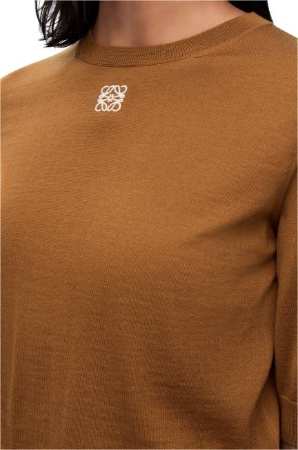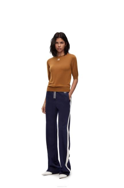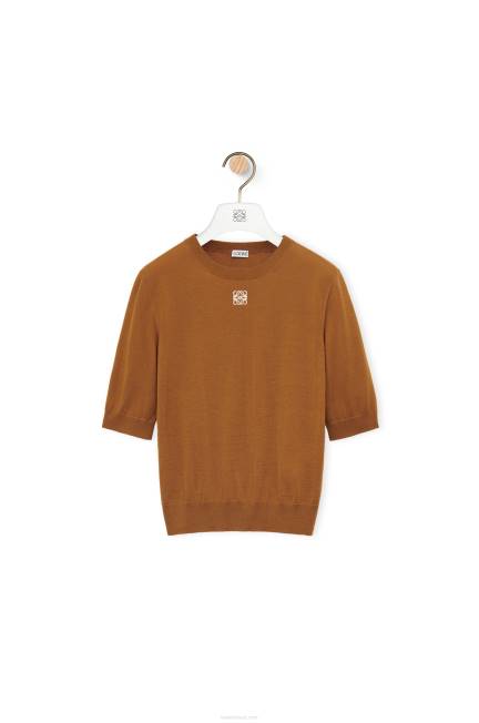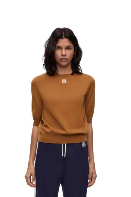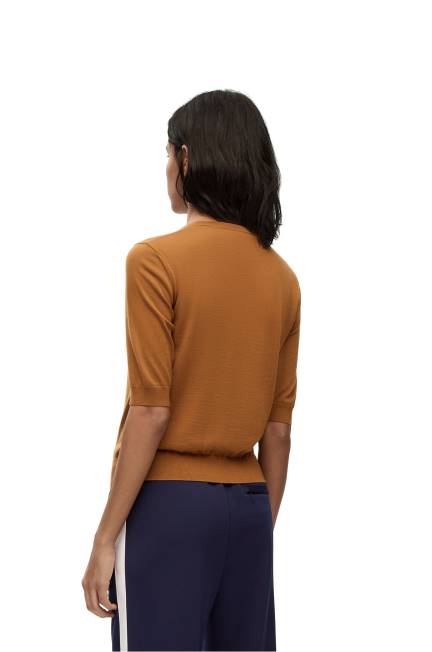 suéter de gola redonda em malha leve de lã com mangas curtas e gola, punhos e bainha canelados.