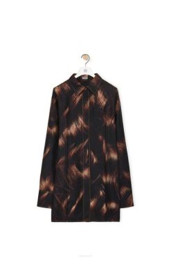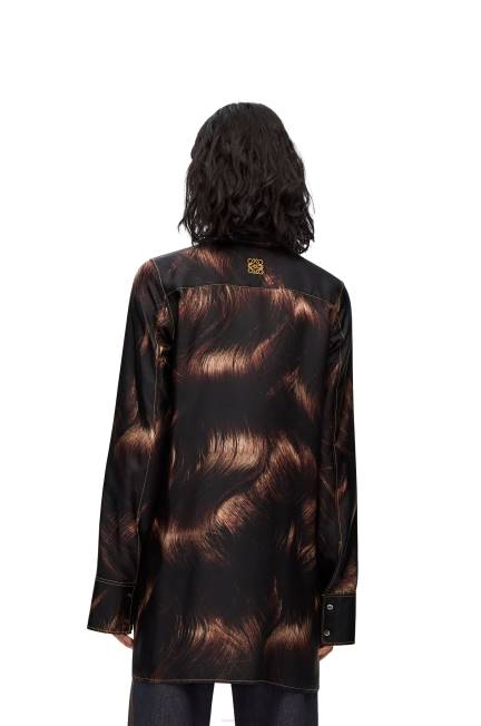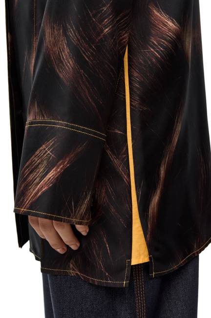 camisa de botão frontal em sarja de seda com estampa de cabelo, pesponto contrastante e anagrama bordado contrastante.