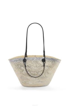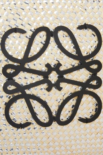 uma cesta tradicional com corpo clássico tecido à mão, alças tubulares de couro de bezerro e anagrama de couro de bezerro bordado. esta versão é tecida com fios de prata brilhantes e é trabalhada em palmeira iraca que é cultivada, colhida e seca ao sol na colômbia, onde é então tecida por mulheres artesãs da corporação oficio y arte, uma organização guiada por princípios de comércio justo.