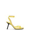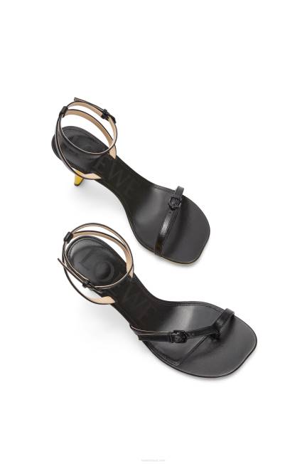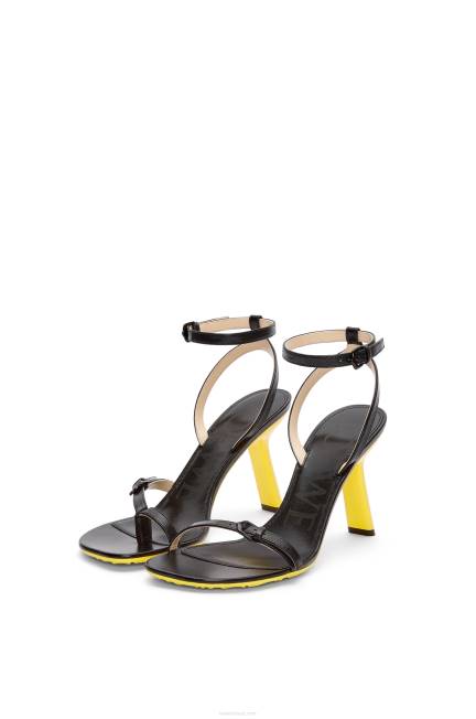 Sandália de salto assimétrico em pele de cordeiro brilhante com biqueira em forma de pétala. Com salto laqueado, tira de tornozelo com fivela e tira de fivela única na ponta do pé. a coleção de sapatos ss23 joga com a tensão e o contraste: o artesanato se choca com uma atitude fetichista e os materiais naturais se chocam com o técnico. os principais detalhes incluem saltos divertidos, logotipos gráficos e dedos e tiras assimétricos.