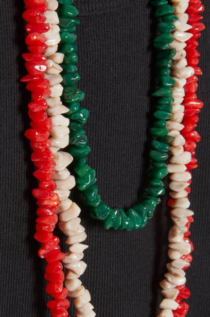 camiseta cropped em malha canelada de algodão com colar de várias fileiras de resina.