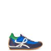 Tênis de cadarço em camurça e nylon em cores contrastantes com logo tonal l e sola de borracha mel que se curva ao redor do dedo do pé e na parte de trás do calcanhar.