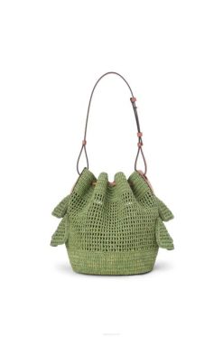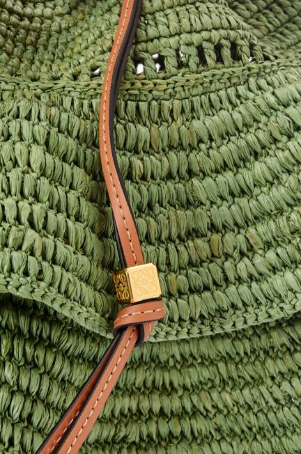 a bolsa balão é reimaginada em babados de ráfia tecida com alça e cordão confeccionados em couro de bezerro.