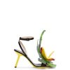 Sandália salto assimétrico em pele de cordeiro brilhante com folha de monstera e flor de antúrio confeccionada em espuma de borracha clara. Com salto laqueado, tira de tornozelo com fivela e tira de fivela única na ponta do pé. a coleção de sapatos ss23 joga com a tensão e o contraste: o artesanato se choca com uma atitude fetichista e os materiais naturais se chocam com o técnico. os principais detalhes incluem saltos divertidos, logotipos gráficos e dedos e tiras assimétricos
