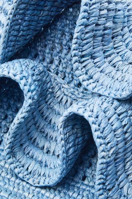 a bolsa balão é reimaginada em babados de ráfia tecida com alça e cordão confeccionados em couro de bezerro.