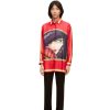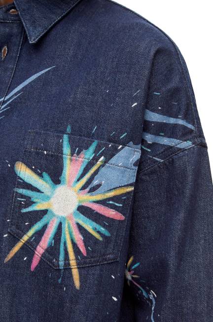 Camiseta de botão frontal em denim com uma impressão de colocação de céu mágico, bolso no peito e punhos abotoados. esta camisa faz parte da coleção cápsula do castelo em movimento da loewe x howl.