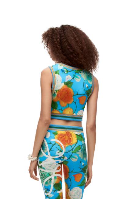 camiseta cropped em jérsei técnico com estampa rosa e listras, gola e bainha caneladas.