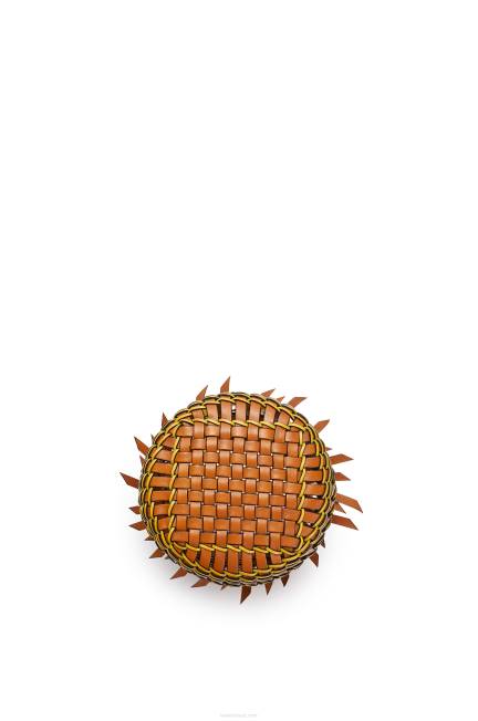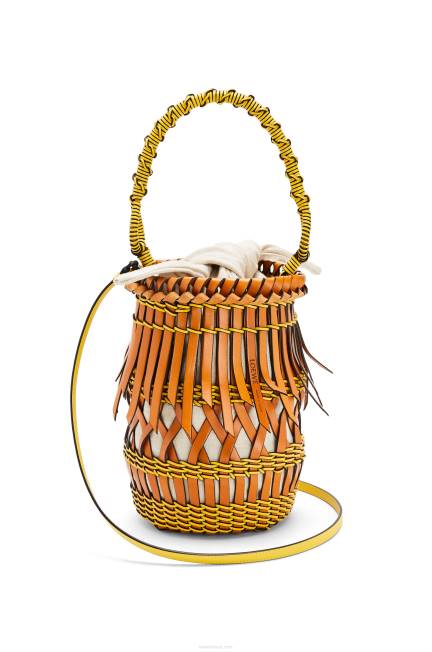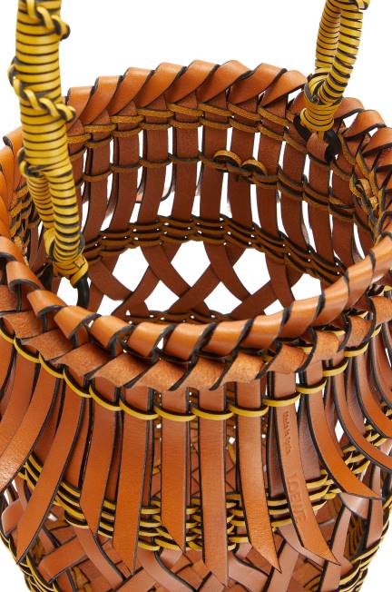 uma bucket bag baseada no desenho do cesto de junco do artesão galego alvaro leiro, inteiramente trabalhada em fitas de pele de bezerro tecidas num motivo cruzado que cria uma estrutura reforçada, interior visível e topo com franjas. esta versão é trabalhada em cores contrastantes.