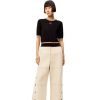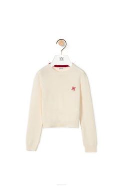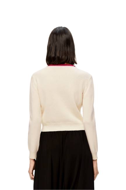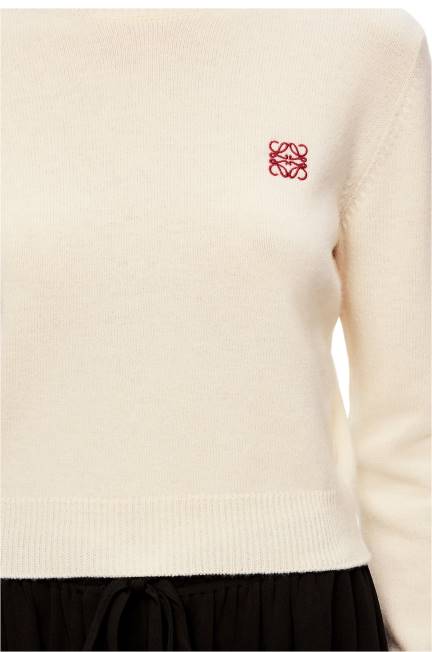 Suéter curto em lã com gola careca e listra contrastante na parte de trás do pescoço e anagrama bordado em contraste.