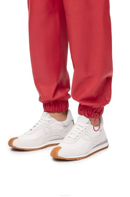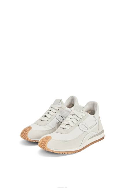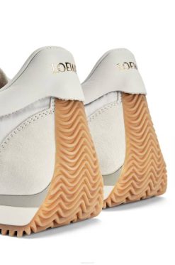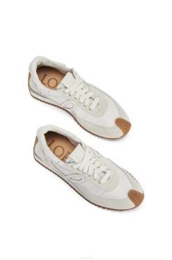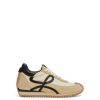 Tênis de cadarço em camurça e nylon com cabedal macio com monograma l e solado de borracha cor de mel que se curva ao redor do dedo do pé e na parte de trás do calcanhar. a coleção de sapatos ss23 joga com a tensão e o contraste: o artesanato se choca com uma atitude fetichista e os materiais naturais se chocam com o técnico. os principais detalhes incluem saltos divertidos, logotipos gráficos e dedos e tiras assimétricos.