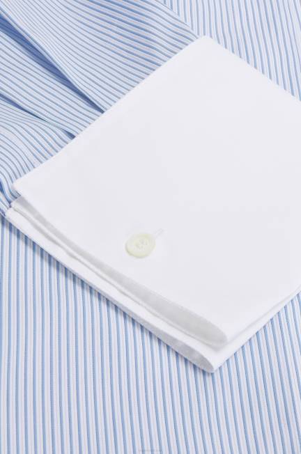 camisa comprida às riscas em popeline de algodão com bainha assimétrica em contraste e punhos franceses.