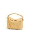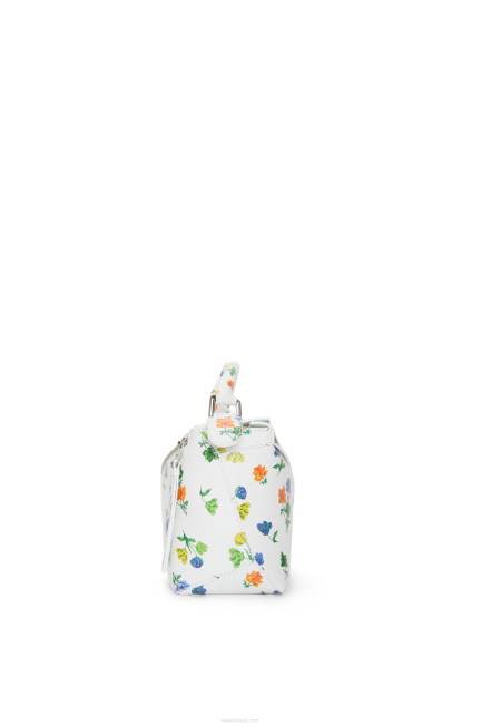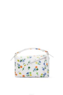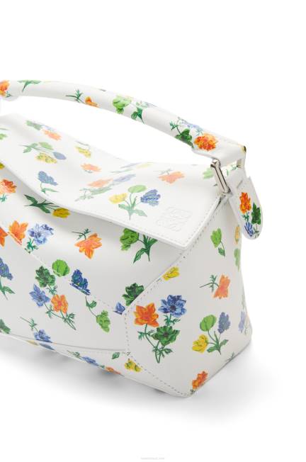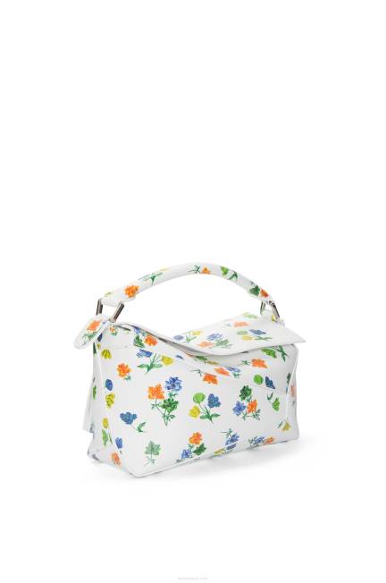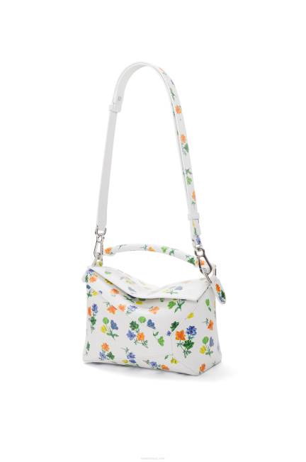 a bolsa quebra-cabeça é a bolsa de estreia da loewe do diretor criativo jonathan anderson. uma forma cubóide e uma técnica de corte precisa criam as linhas geométricas distintas do quebra-cabeça. esta versão pequena é confeccionada em couro de bezerro acetinado com estampa de flores e tem bordas pespontadas.