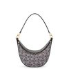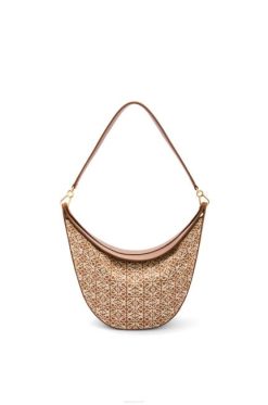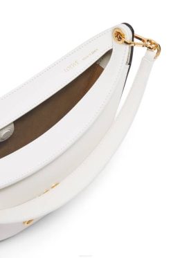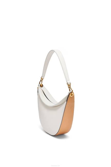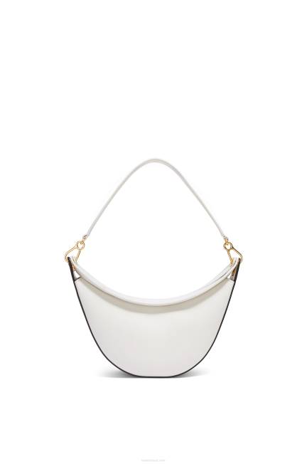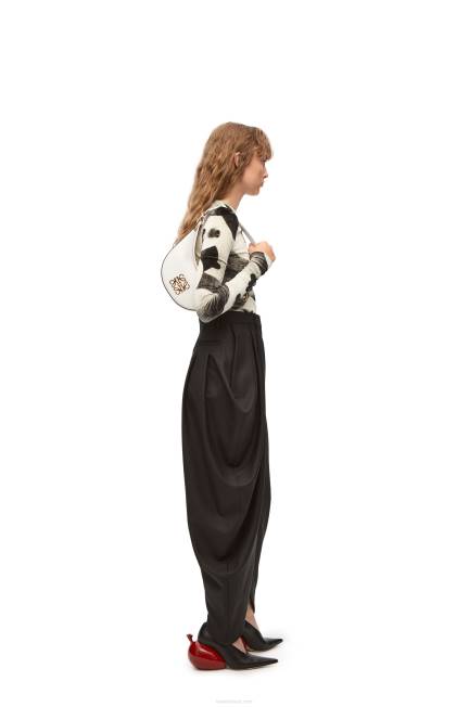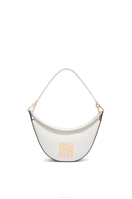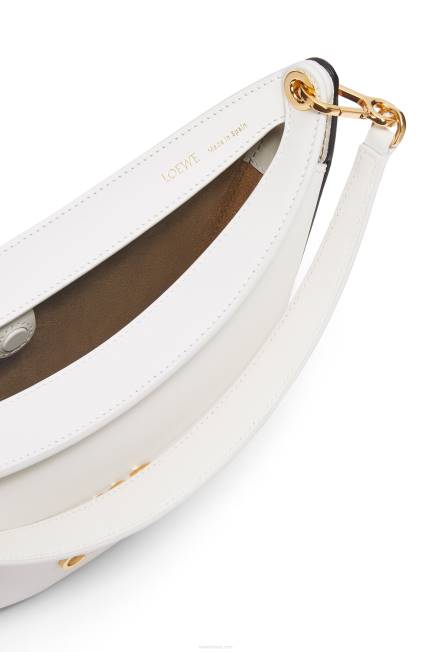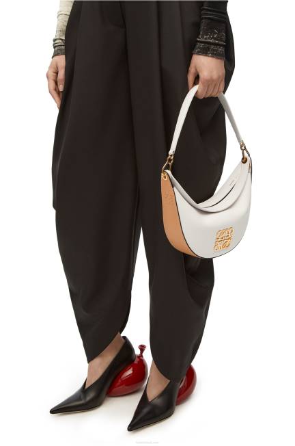a loewe luna é uma bolsa hobo meia-lua meticulosamente trabalhada com uma silhueta escultural e um fecho de lábio duplo curvo. um ilhó deslizante oculto permite que a bolsa seja personalizada com um pingente ou uma alça adicional. esta versão pequena é confeccionada em couro de bezerro acetinado com um anagrama dourado na frente e fundo contrastante.