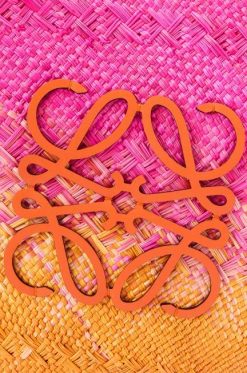 uma cesta tradicional com um corpo clássico tecido à mão, alças de couro de bezerro e um anagrama de couro de bezerro bordado. esta grande versão degrade é trabalhada na palmeira iraca que é cultivada, colhida e seca ao sol na colômbia, onde é então tecida por mulheres artesãs da corporação oficio y arte, uma organização guiada por princípios de comércio justo.