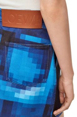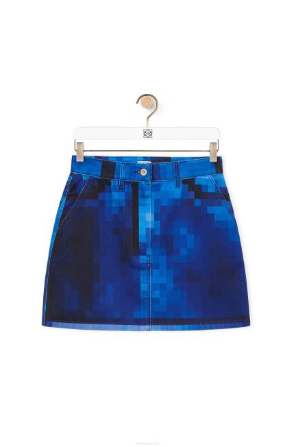 minissaia em jeans com estampa digital pixelada integral, bolsos laterais e um bolso traseiro patch.