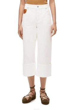 Jeans de cinco bolsos afunilados em jeans de algodão lavado com pedraria e um bolso traseiro em couro de bezerro contrastante com anagrama perfurado.