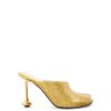 slide de calcanhar com parte superior transparente com formato de pétala e calcanhar de brinquedo laqueado.
