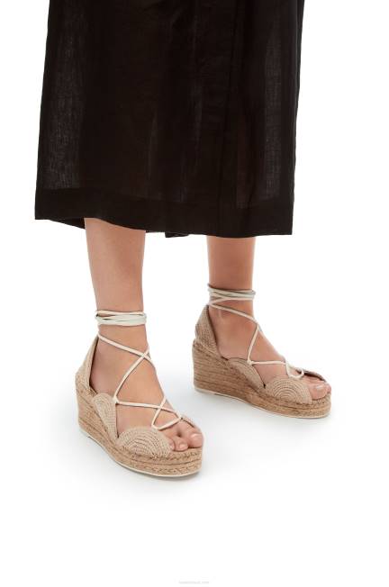 Alpargatas com cadarço feitas à mão em juta com elementos semicirculares trançados no cabedal. com cadarços em pele de carneiro tubular.
