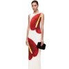 vestido drapeado em jersey crepe com decote nas costas, recorte no busto, laço de cetim na frente e saia godê semitransparente com detalhe franzido.