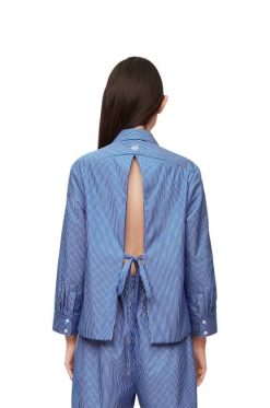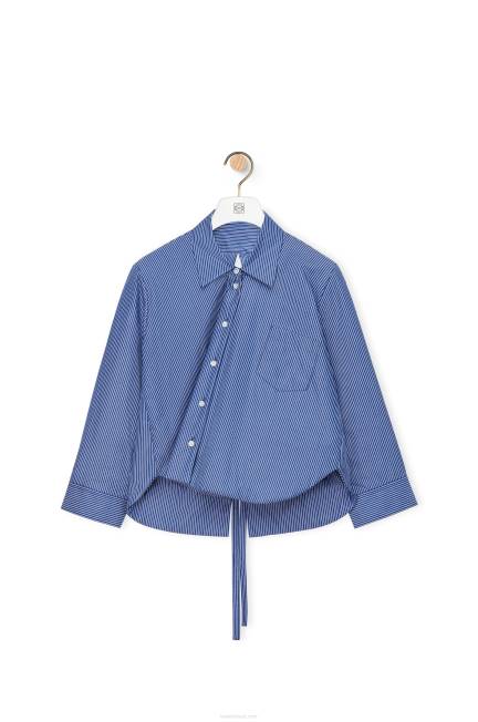 Camisa cropped em trapézio em popeline de algodão às riscas almofadada. costas divididas com laços que podem ser presos na frente ou nas costas. pode ser usado abotoado como uma forma de trapézio ou como uma forma assimétrica enrolada graças ao botão de punho do colarinho .