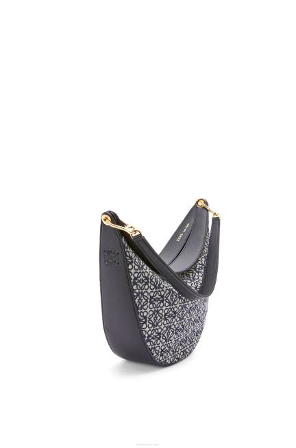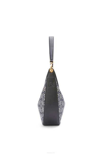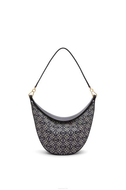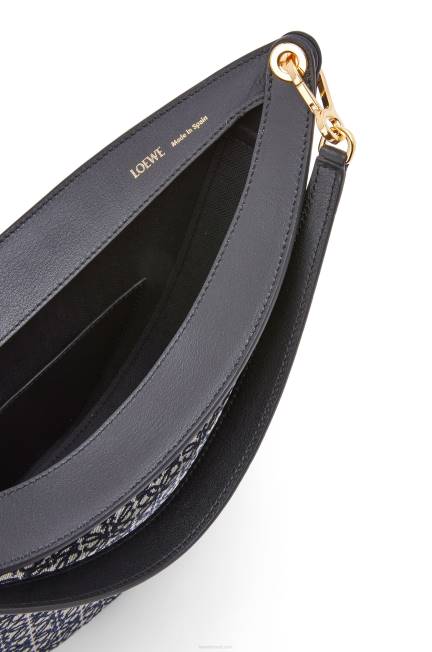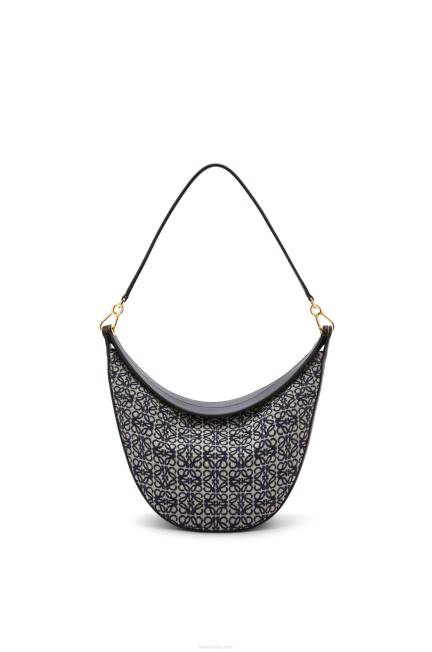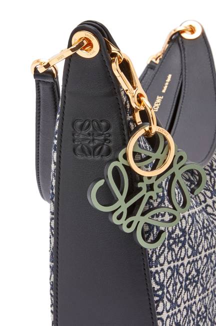 a loewe luna é uma bolsa hobo meia-lua meticulosamente trabalhada com uma silhueta escultural e um fecho de lábio duplo curvo. um ilhó deslizante oculto permite que a bolsa seja personalizada com um pingente ou uma alça adicional. esta versão é confeccionada em jacquard anagrama e couro de bezerro clássico.
