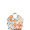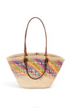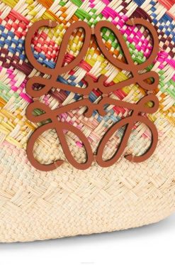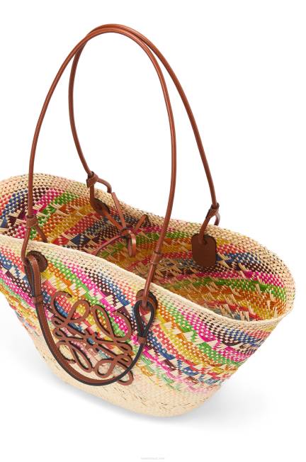 uma cesta tradicional com corpo clássico tecido à mão, alças tubulares de couro de bezerro e alças superiores de couro de bezerro e um anagrama de couro de bezerro bordado. esta versão do arco-íris é trabalhada em palmeira iraca que é cultivada, colhida e seca ao sol na colômbia, onde é então tecida por mulheres artesãs da corporação oficio y arte, uma organização guiada por princípios de comércio justo.
