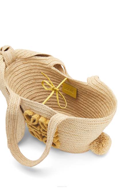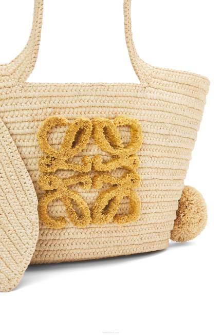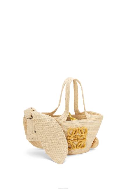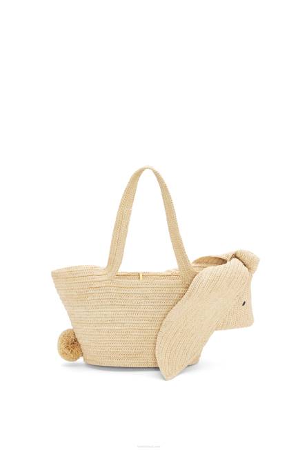 uma bolsa híbrida confeccionada em couro de bezerro e ráfia que combina a silhueta diferenciada da bolsa loewe basket com cabeça e orelhas de coelho, cauda de pompom e anagrama de ráfia.