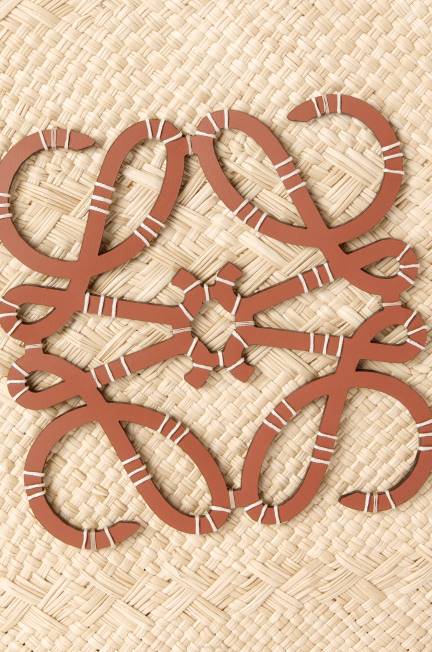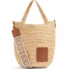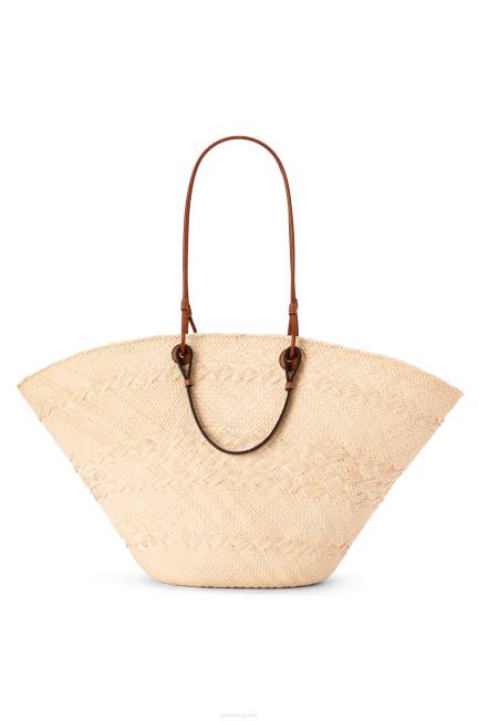 uma cesta tradicional com um corpo clássico tecido à mão, alças de couro de bezerro e um anagrama de couro de bezerro bordado. esta versão grande é trabalhada em palmeira iraca que é cultivada, colhida e seca ao sol na colômbia, onde é então tecida por mulheres artesãs da corporação oficio y arte, uma organização guiada por princípios de comércio justo.