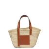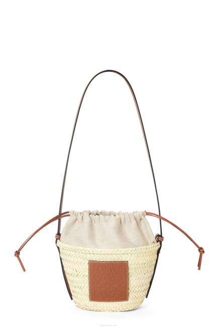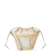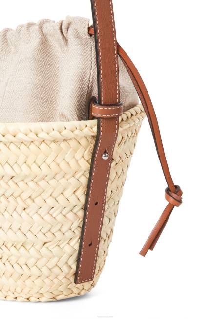 uma bolsa bucket elevada com corpo clássico tecido à mão em folha de palmeira, alça de ombro em couro de bezerro e top com cordão em lona espinha de peixe.