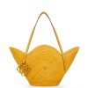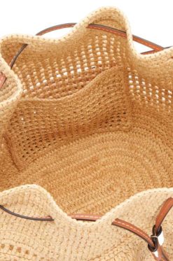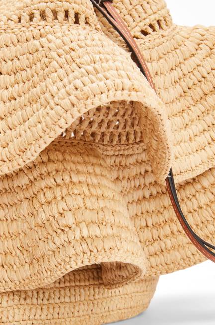 a bolsa balão é reimaginada em babados de ráfia tecida com alça e cordão confeccionados em couro de bezerro.