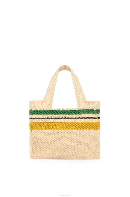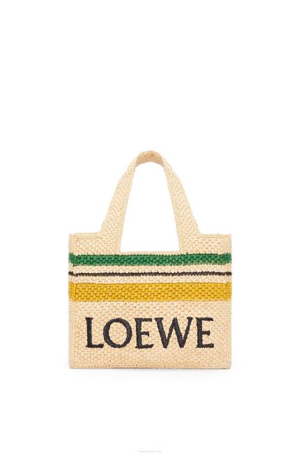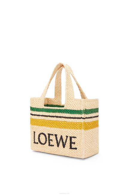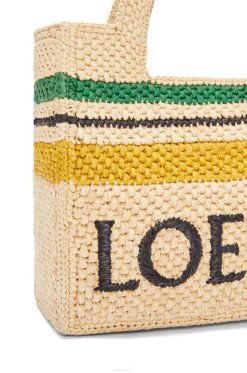 a bolsa loewe font é uma bolsa em forma de cubo, tecida inteiramente em ráfia com uma assinatura loewe contrastante. esta é uma versão pequena com listras.