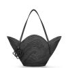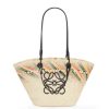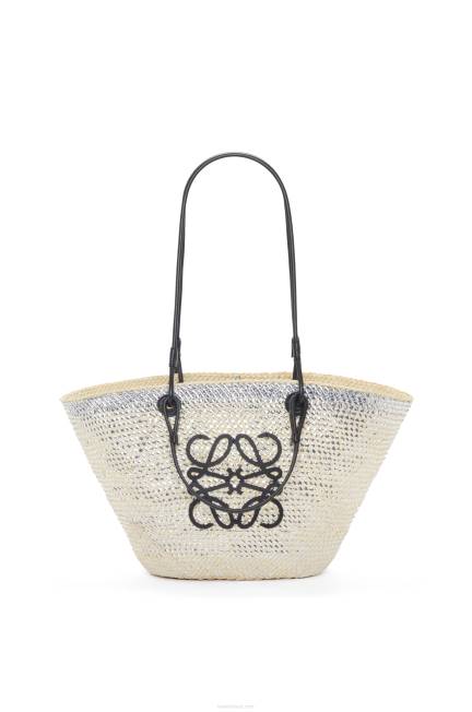 uma cesta tradicional com corpo clássico tecido à mão, alças tubulares de couro de bezerro e anagrama de couro de bezerro bordado. esta versão é tecida com fios de prata brilhantes e é trabalhada em palmeira iraca que é cultivada, colhida e seca ao sol na colômbia, onde é então tecida por mulheres artesãs da corporação oficio y arte, uma organização guiada por princípios de comércio justo.