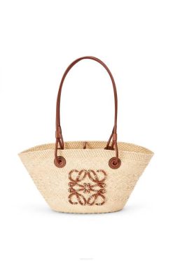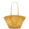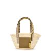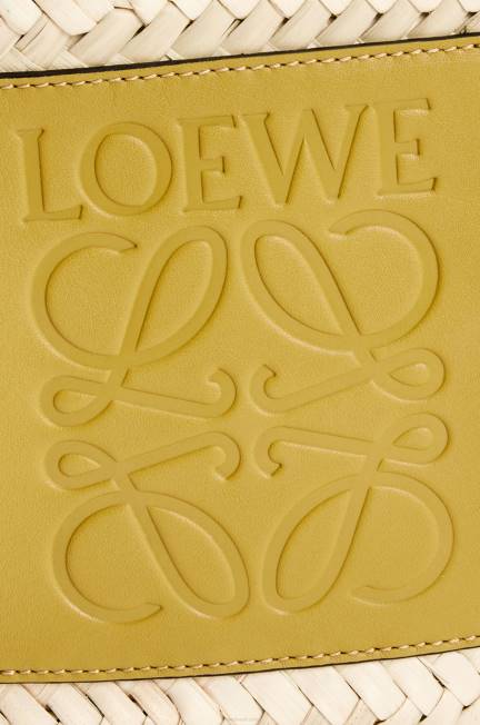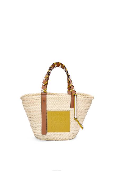 uma cesta tradicional elevada com alças superiores de couro de bezerro trançado. esta versão é confeccionada em folha de palmeira e couro de bezerro.