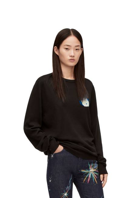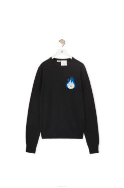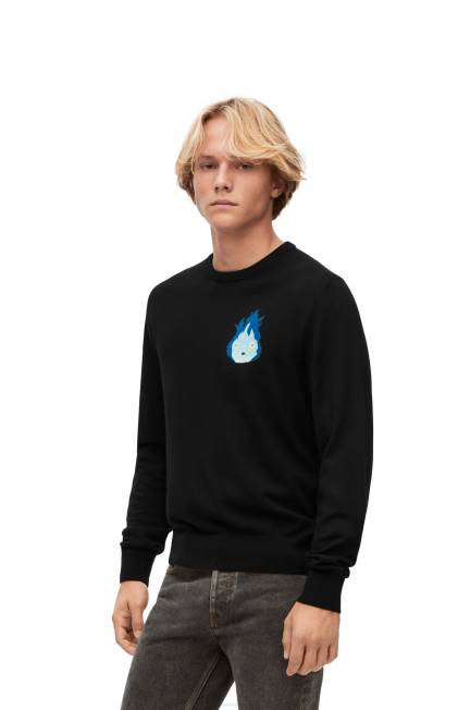 Camisola de gola redonda em lã leve com jacquard intarsia calcifer no peito e loewe nas costas. com gola, punhos e barra canelados. este suéter faz parte da coleção cápsula do castelo em movimento da loewe x howl.