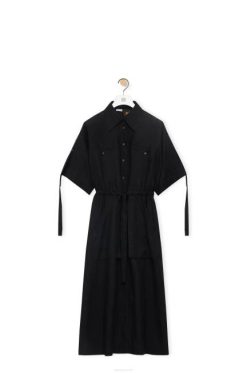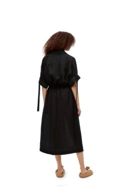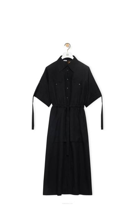 vestido workwear com abotoamento frontal em linho com cordão na cintura, alças ajustáveis nas mangas e bolsos oversized