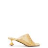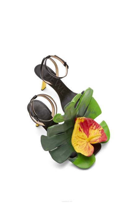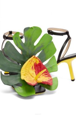 Sandália salto assimétrico em pele de cordeiro brilhante com folha de monstera e flor de antúrio confeccionada em espuma de borracha clara. Com salto laqueado, tira de tornozelo com fivela e tira de fivela única na ponta do pé. a coleção de sapatos ss23 joga com a tensão e o contraste: o artesanato se choca com uma atitude fetichista e os materiais naturais se chocam com o técnico. os principais detalhes incluem saltos divertidos, logotipos gráficos e dedos e tiras assimétricos