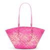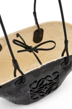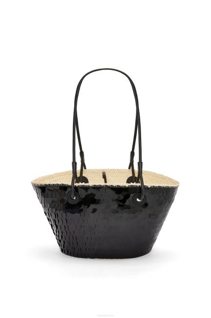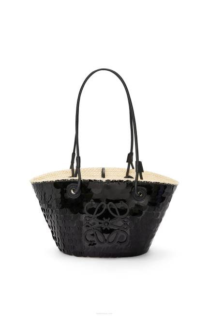 uma cesta tradicional com corpo clássico tecido à mão, alças tubulares de couro de bezerro e anagrama de couro de bezerro bordado. esta pequena versão com lantejoulas é bordada à mão em um processo que leva até 21 horas. é confeccionada com a palmeira iraca, que é cultivada, colhida e seca ao sol na colômbia, onde é tecida por mulheres artesãs da corporação oficio y arte, uma organização guiada pelos princípios do comércio justo.