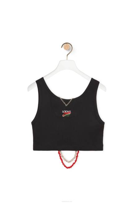 camiseta cropped em malha canelada de algodão com colar de várias fileiras de resina.